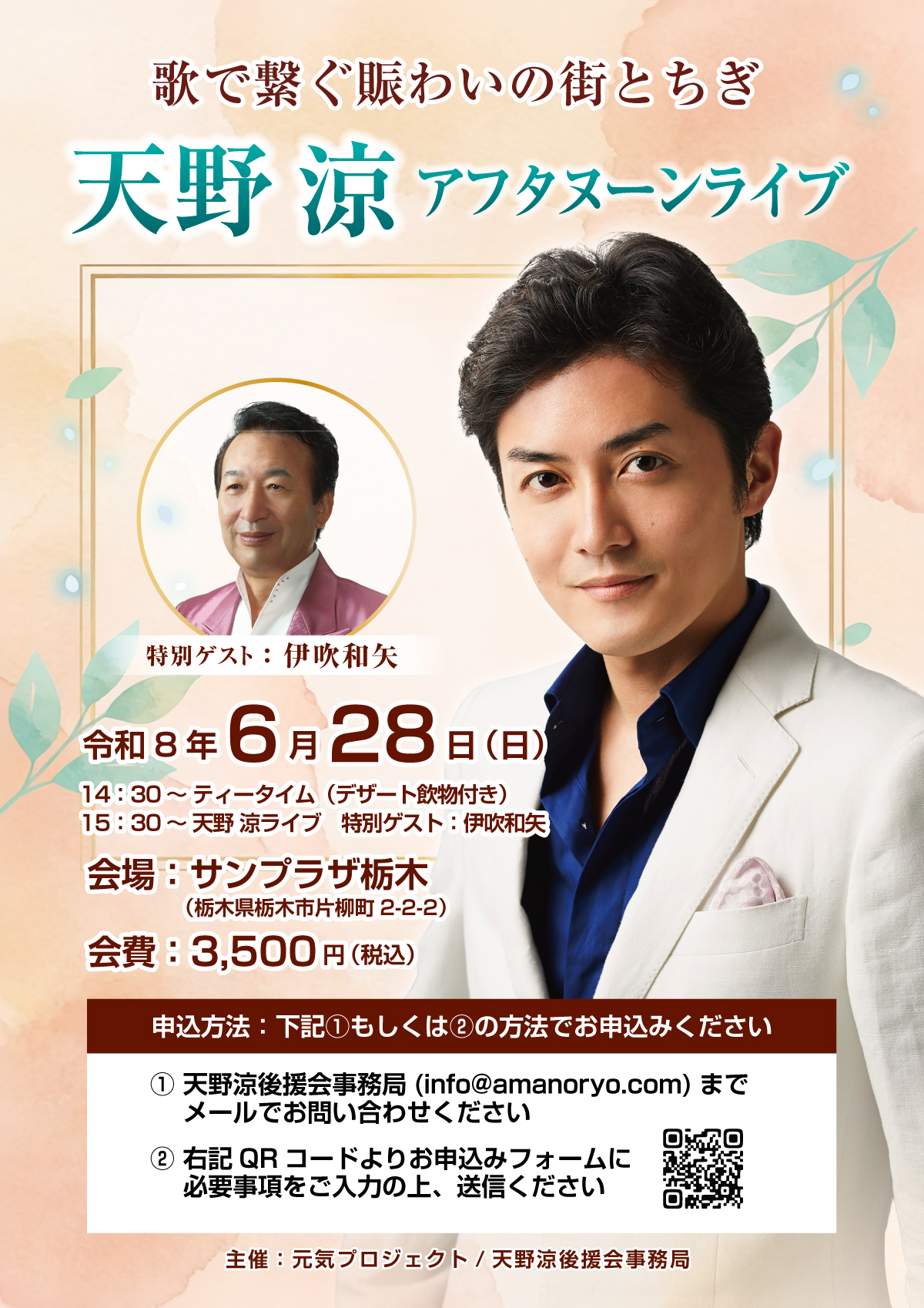 イベント 天野涼アフタヌーンライブ @サンプラザ栃木 天野涼アフタヌーンライブ @サンプラザ栃木 6月28日(日) 会場/サンプラザ栃木(栃木県栃木市片柳町2-2-2) 時間/14:30~ティータイム 15:30~天野涼ライブ 料金/3,500円 特別ゲスト/伊吹和矢